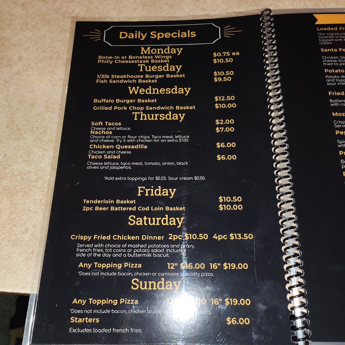 Mornings are made cozy with hearty breakfast options like eggs with bacon and hash browns or fluffy pancakes, perfect for starting the day on a satisfying note. For lunch and dinner, the menu offers a selection of burgers with various toppings, alongside traditional dinner entrees such as homemade chicken and noodles. The variety of pizzas are baked to a classic, simple style, offering straightforward flavors that pair well with the friendly and unpretentious vibe of the space.